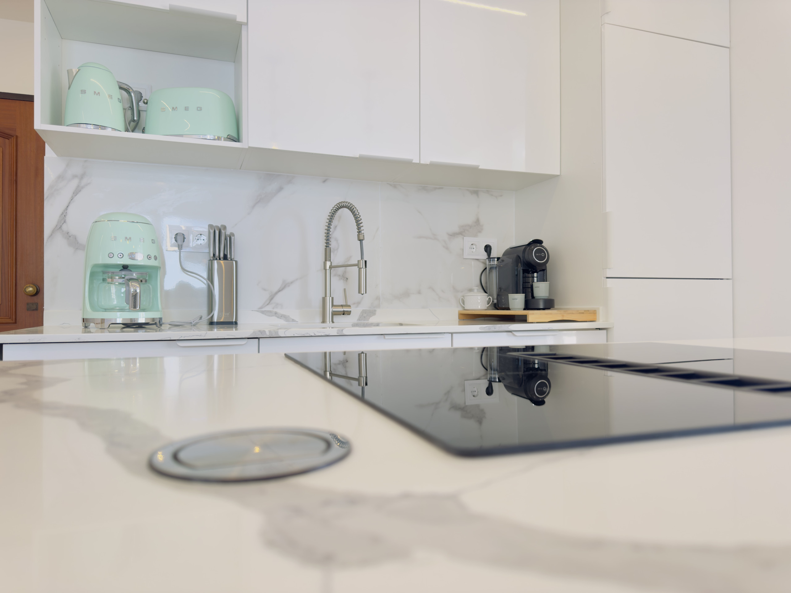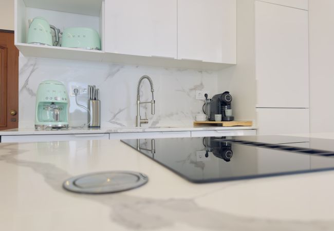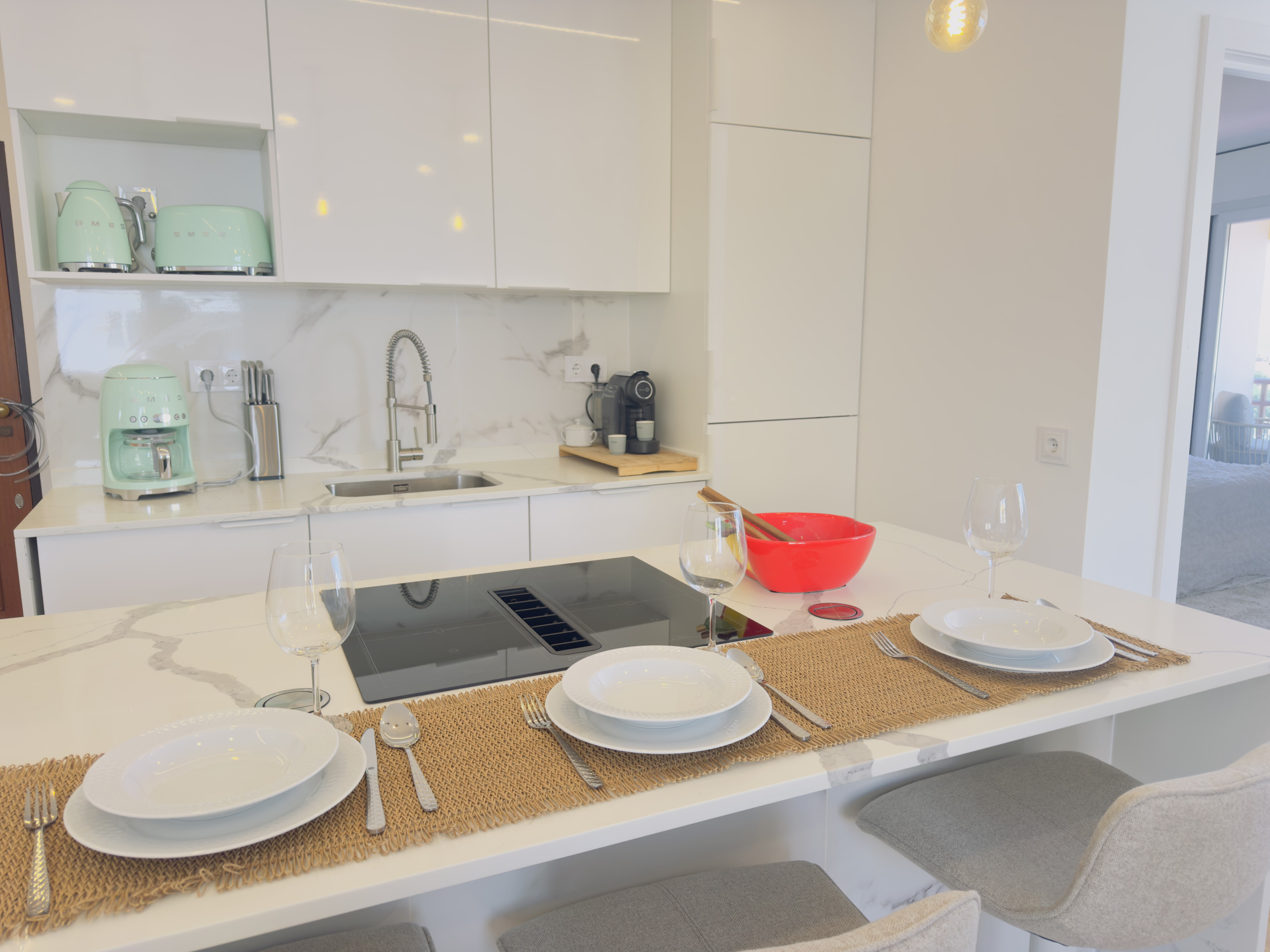A kitchenette, de inducção, está equipada com frigorífico, microondas, forno, congelador, máquina de lavar louça, louça/talheres, utensílios/cozinha, máquina de café, torradeira e jarro eléctrico.
